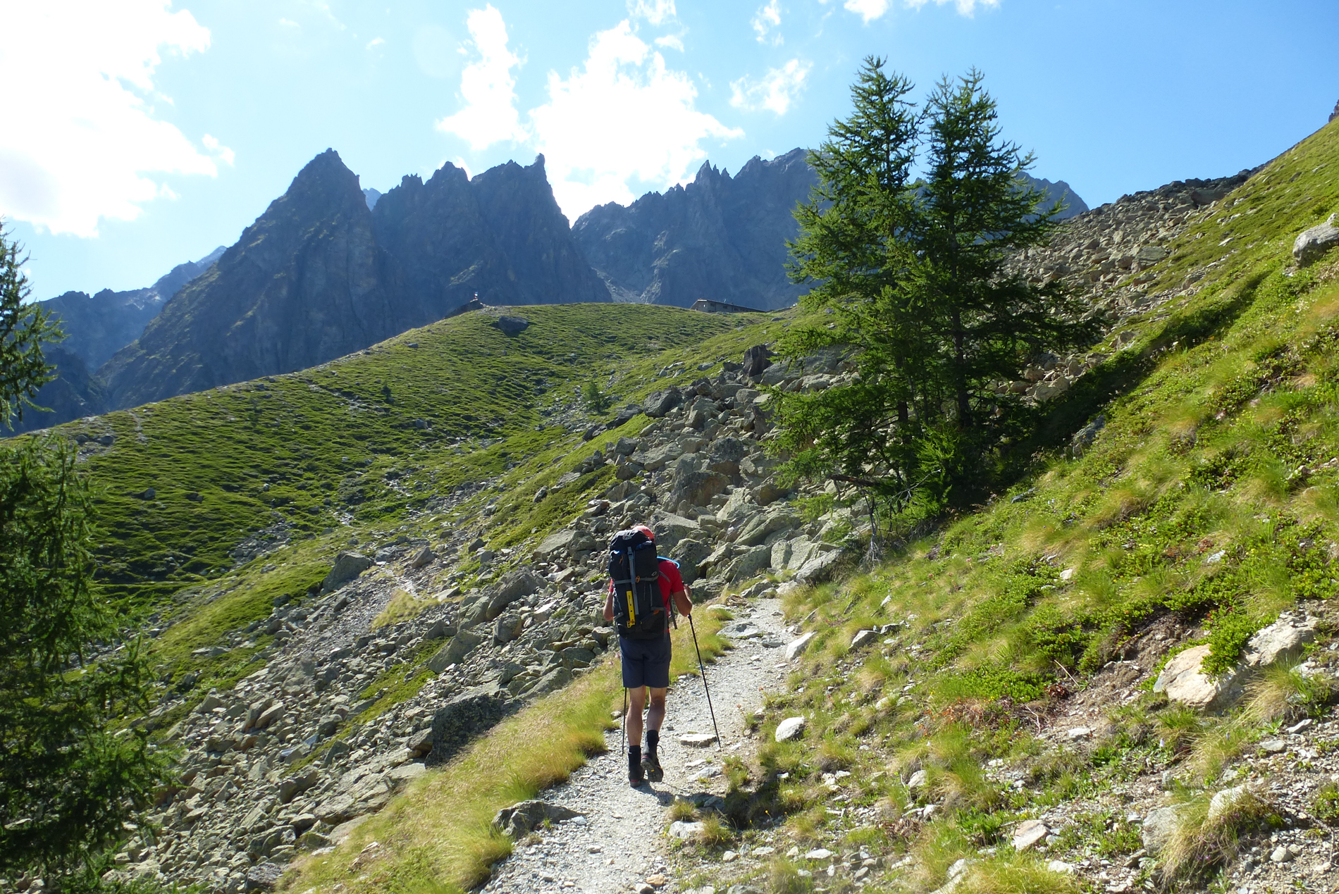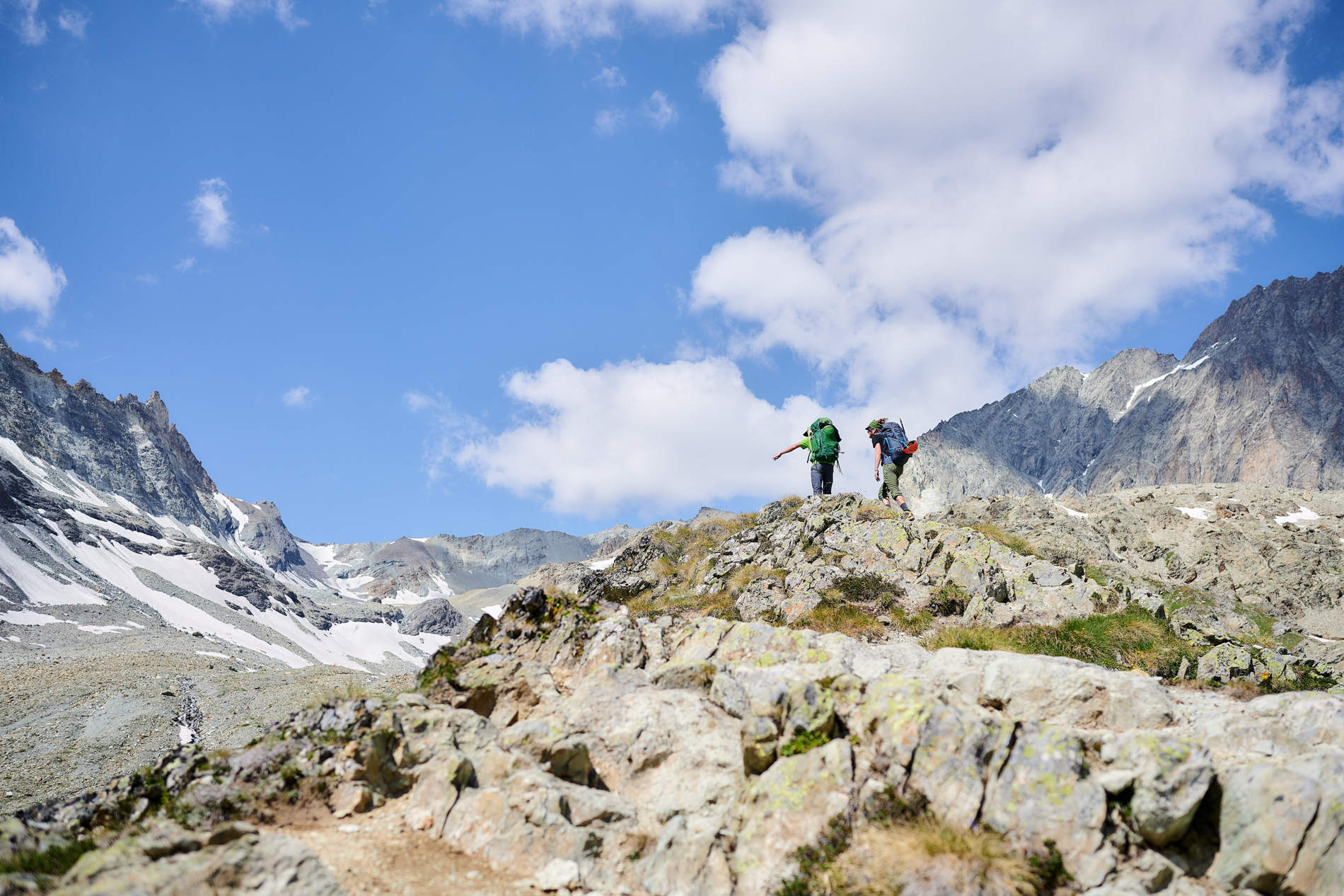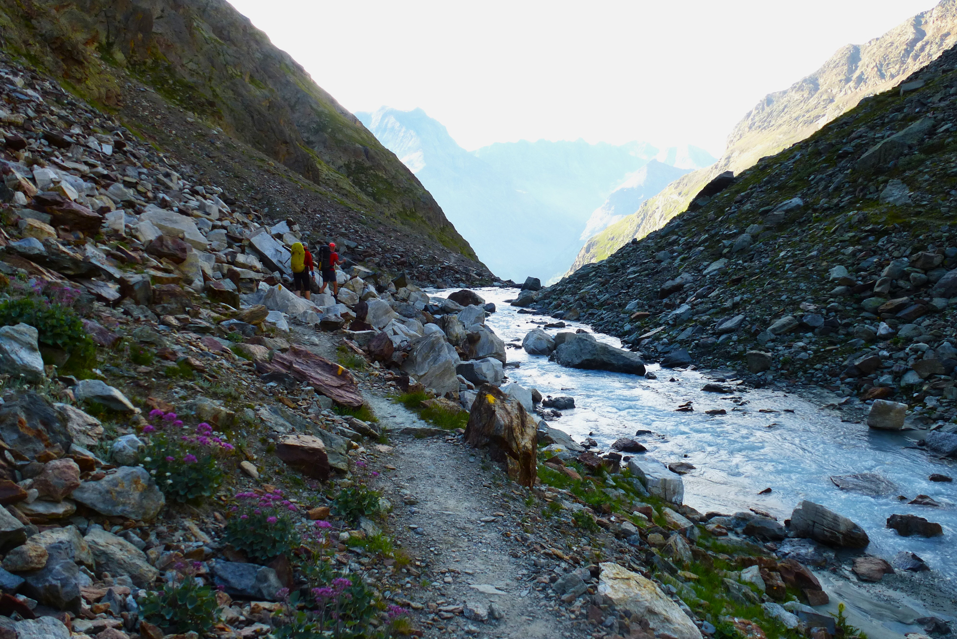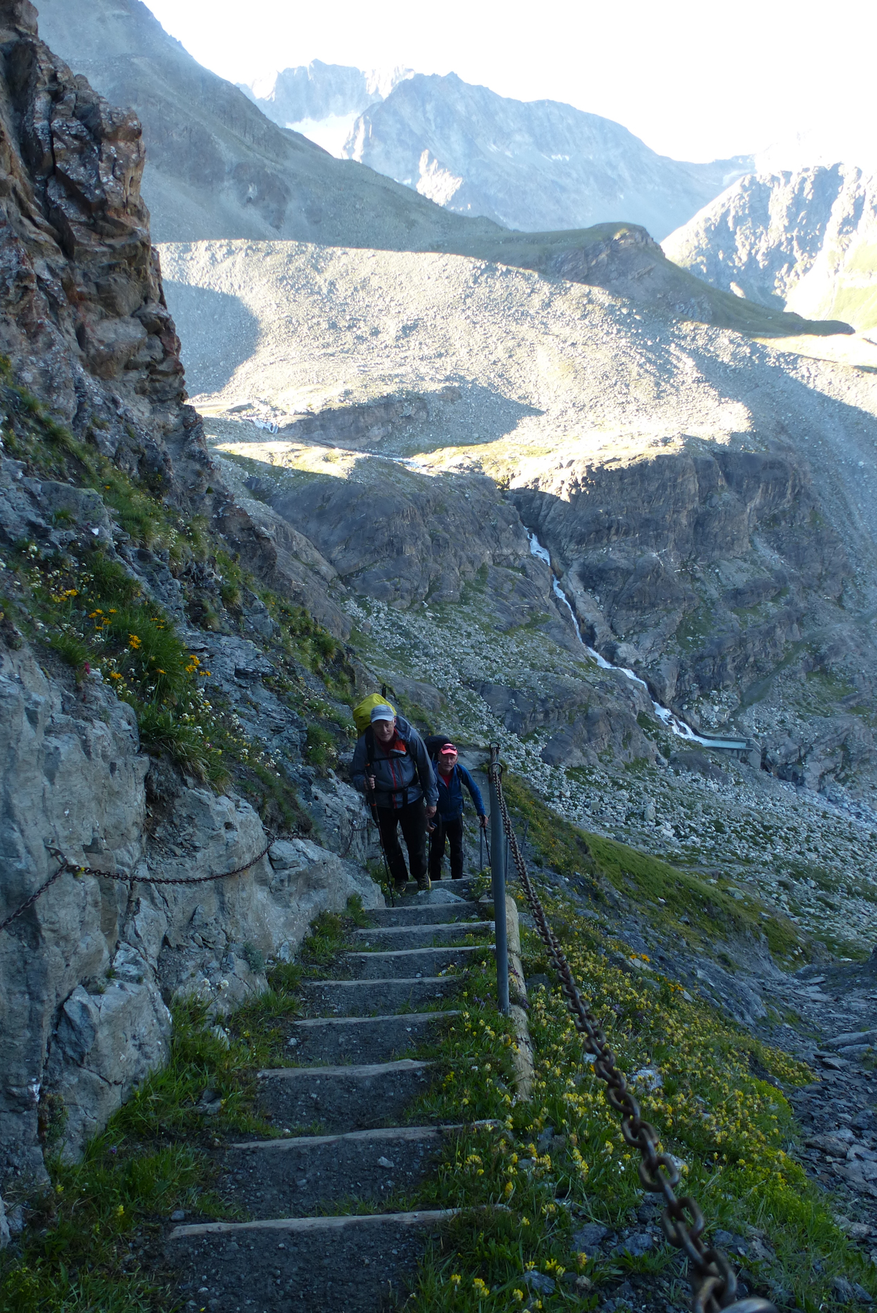 Een technisch eenvoudige hoogalpiene tocht gaat deels over alpiene paden (blauw-wit). Ook ga je over gletsjers en door ongebaand terrein met regelmatig steile pasovergangen en geëxponeerde passages (bijv. langs afgronden zonder staalkabel).