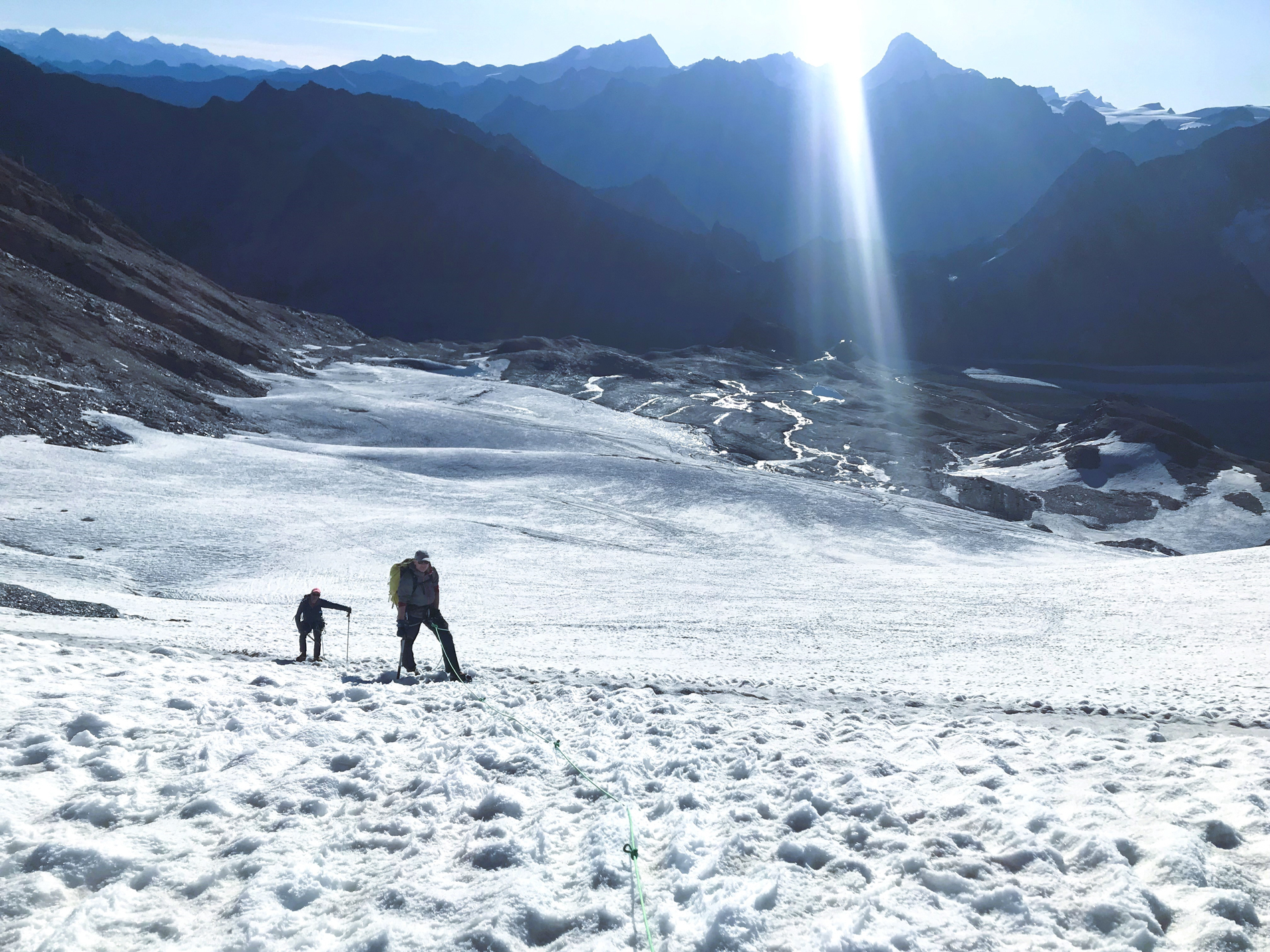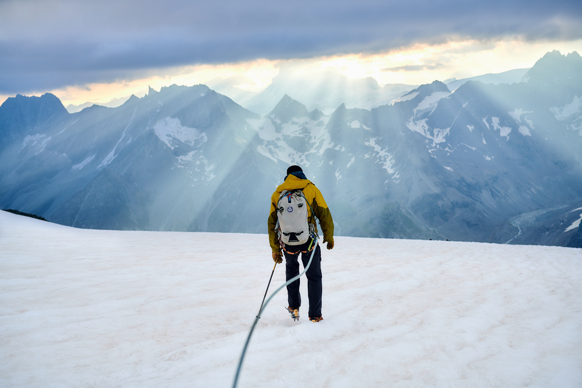 Een hoogalpiene tocht is een meerdaagse huttentocht door gletsjerlandschap met steile flanken en diepe spleten. Je beklimt toppen, slaapt in berghutten of bivakken, en ervaart de kracht van sneeuw en ijs. Voor deze tochten is ervaring vereist, zoals deelname aan een alpiene basiscursus of een eerdere hoogalpiene tocht.