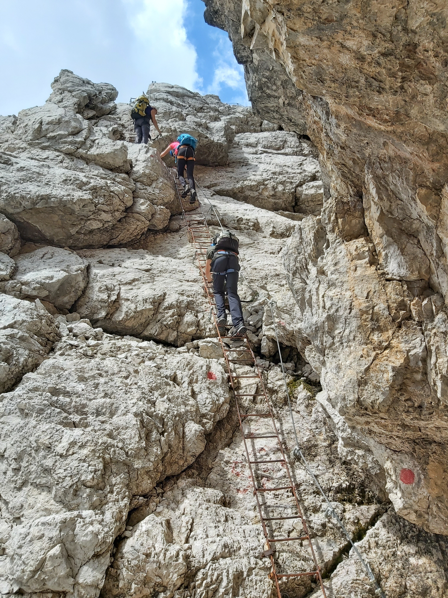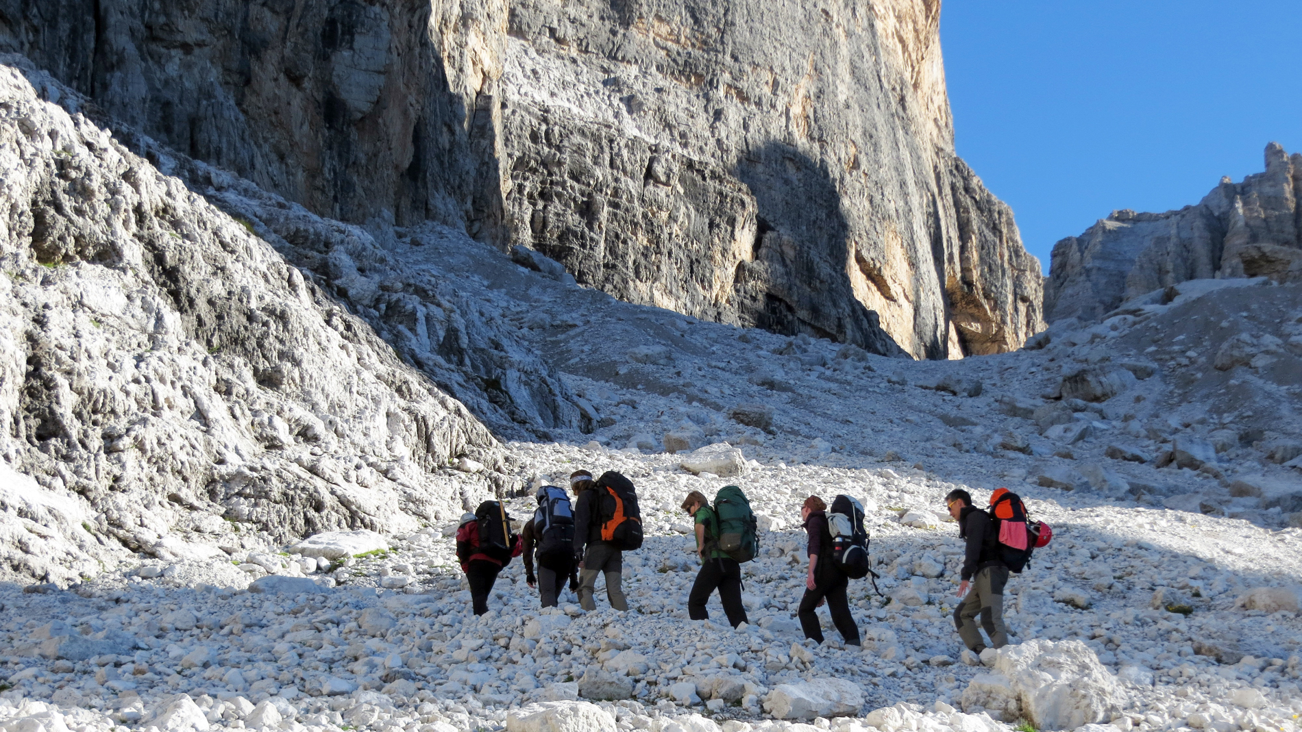 Je start met een gedegen klettersteiginstructie. Daarna volg je de beroemde ‘ijzeren wegen’: via ferrata’s zoals de Via delle Bocchette Centrale, de Vie Ferrata Brentari en Castiglioni. Goed gezekerd klim je langs kilometers staalkabel, ladders en treden. Dit is een tocht voor wie rots wil voelen, diepte wil ervaren en ’s middags wil nagenieten in Italiaanse sfeer.