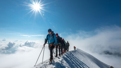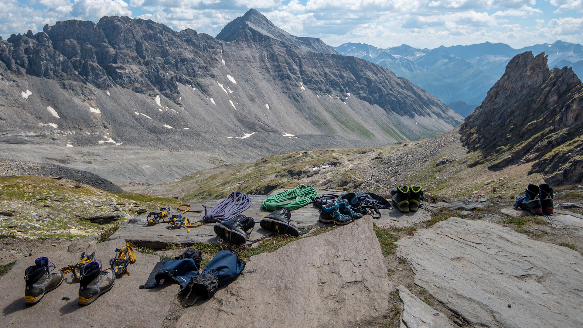 Bergsportreizen zorgt voor de klimtechnische uitrustingsstukken zoals pickel, stijgijzers, bergsporthelm, sportklimgordel en touw.