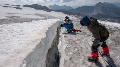 In de middag- en avonduren besteden jullie tijd aan belangrijke onderwerpen als materiaal, planning en weerkunde. Maar het echte avontuur begint in de bergen. Vlakbij de hut oefenen jullie samen met stijgijzers lopen, leren remmen in sneeuw, en trainen reddingstechnieken. Wie durft zich te laten zakken in een gletsjerspleet, terwijl zijn of haar tochtgenoten klaarstaan om te helpen?