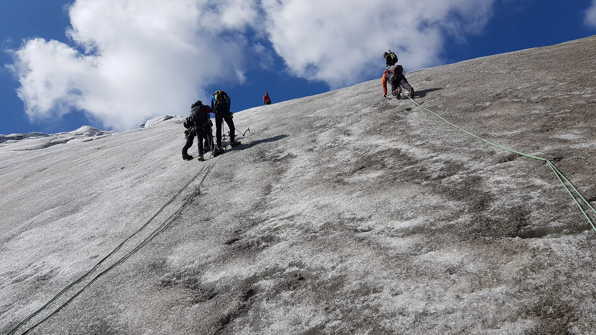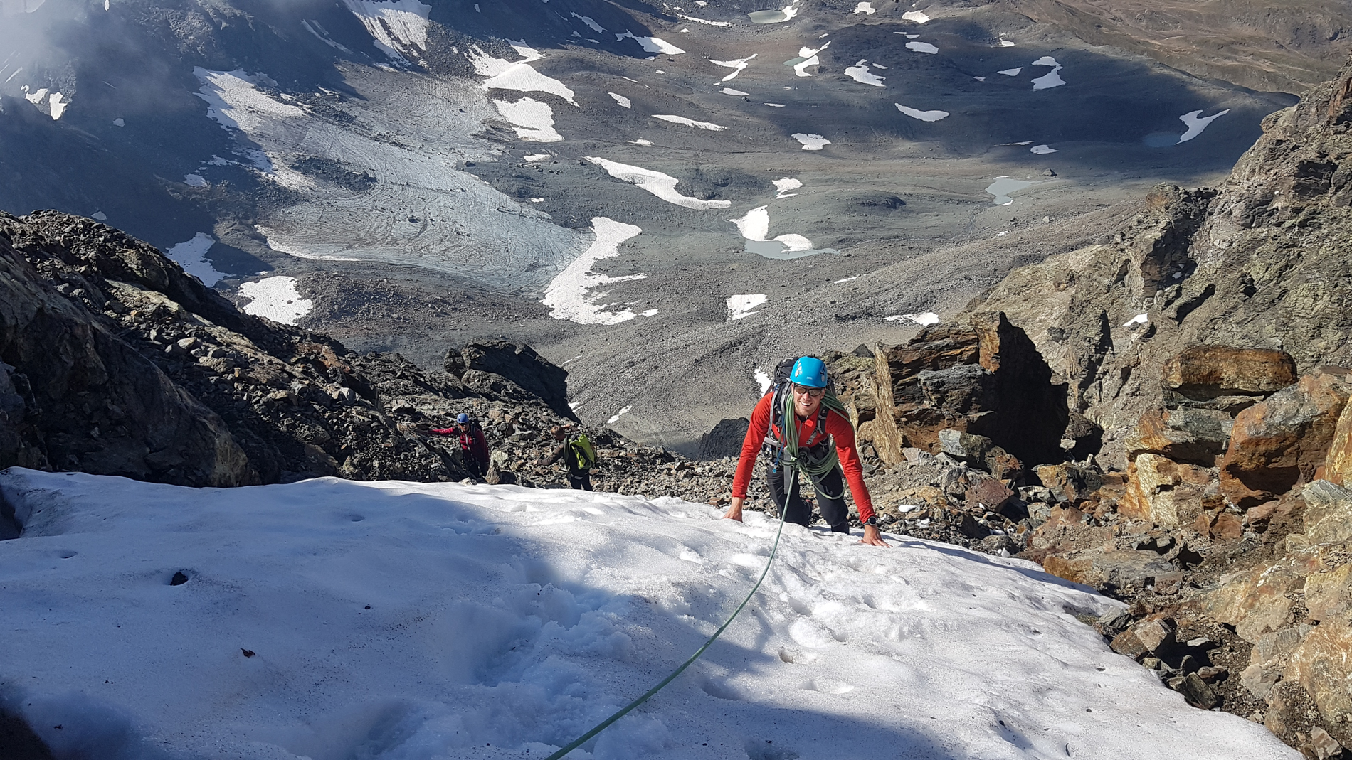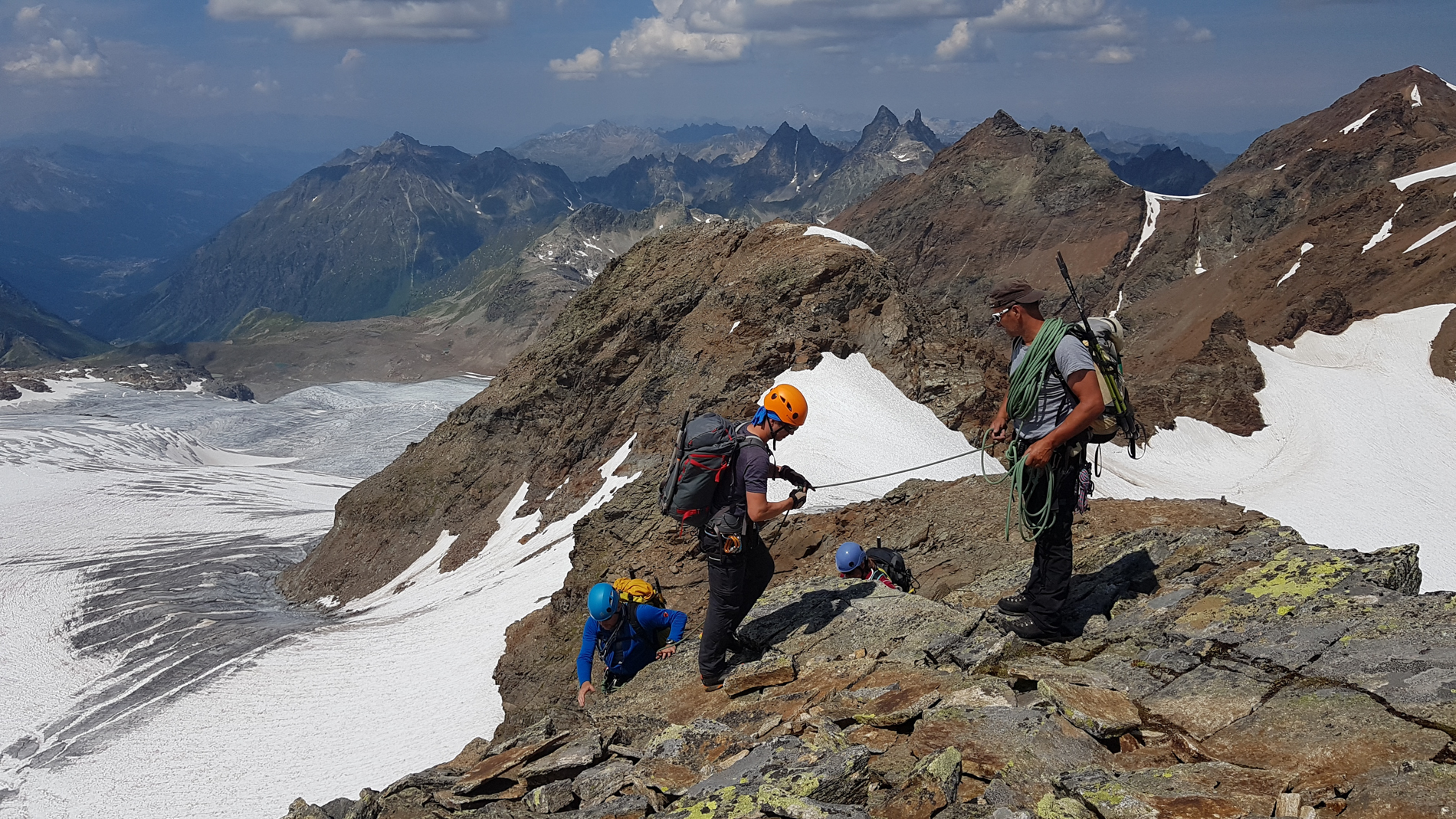 Op de Ochsentaler gletsjer oefen je stijgtechniek in stijl ijs en perfectioneer je reddingstechnieken in het spletenlabyrint op weg naar het gletsjerplateau. Daarna beklim je via twee steile ijswanden de Signalhorn (3210 m) en steek je over naar de Tuoi Hütte via een imposante rotsgraat.