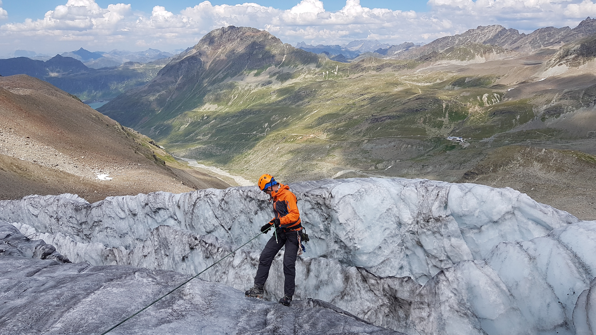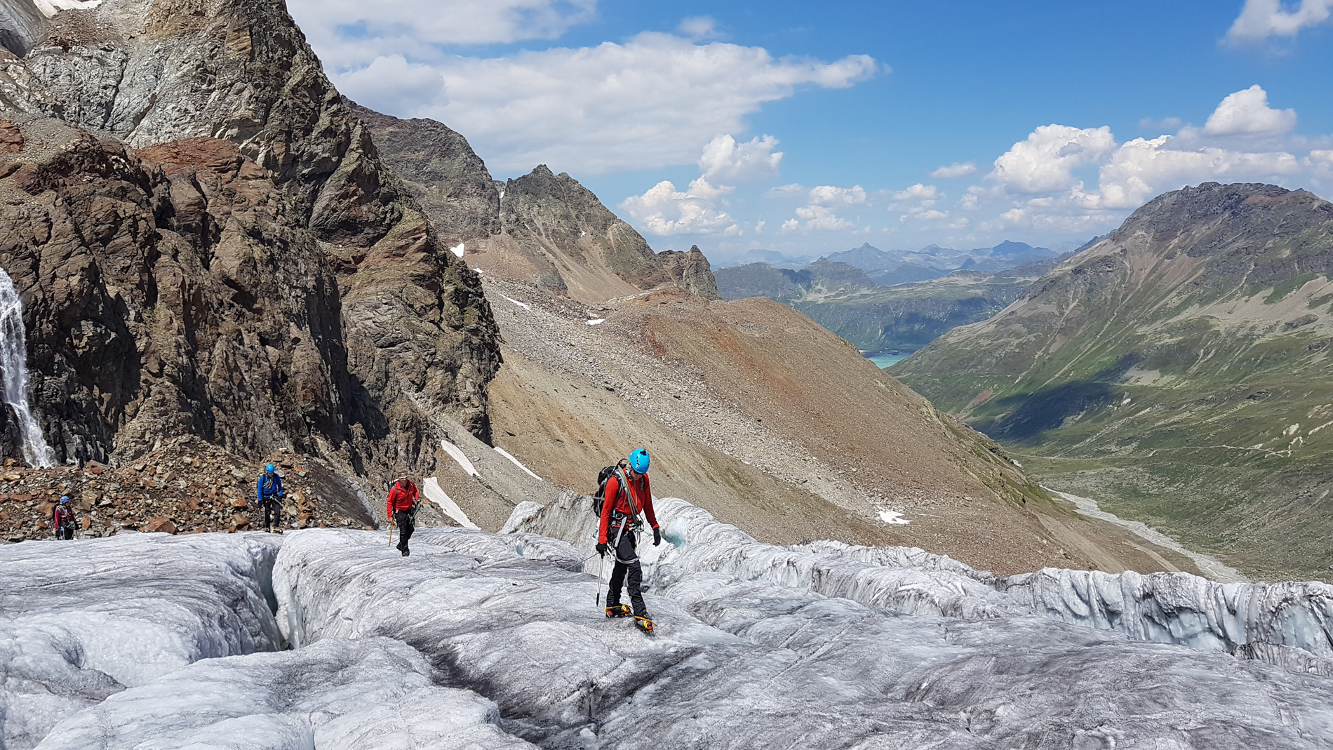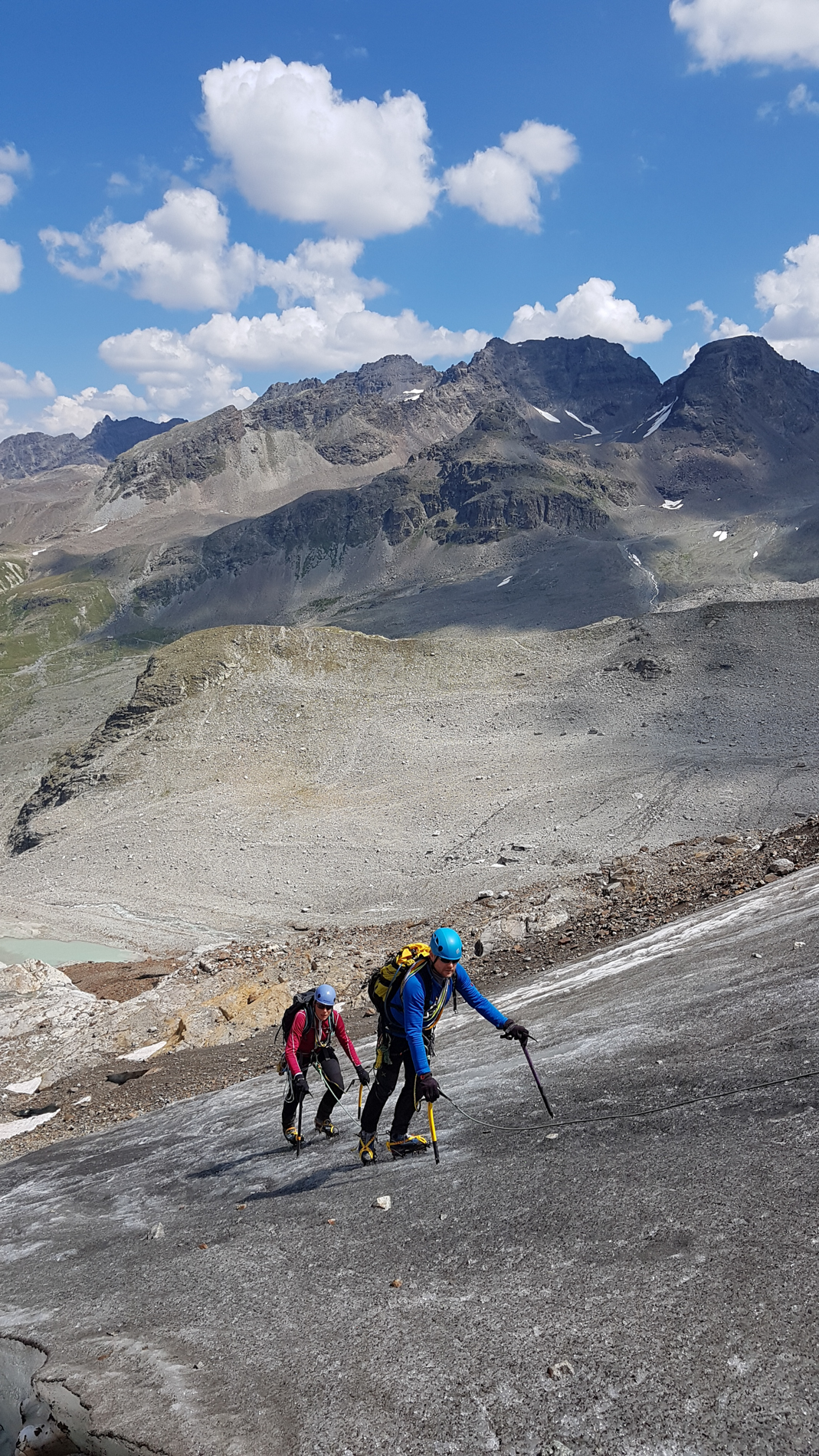 Op de Ochsentaler gletsjer oefen je stijgtechniek in stijl ijs en perfectioneer je reddingstechnieken in het spletenlabyrint op weg naar het gletsjerplateau. Daarna beklim je via twee steile ijswanden de Signalhorn (3210 m) en steek je over naar de Tuoi Hütte via een imposante rotsgraat.