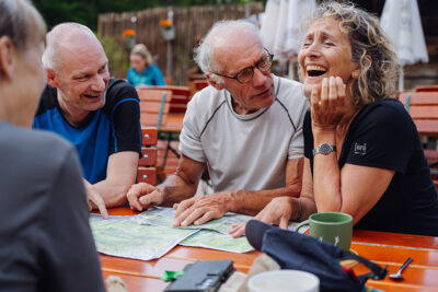 Hoewel je in de meeste berghutten geen culinaire hoogstandjes moet verwachten, wordt het eten in de hut steeds beter. Met dieetwensen als vegetarische maaltijden wordt doorgaans rekening gehouden als je deze bijtijds doorgeeft. Houd er wel rekening mee dat je in hooggelegen hutten die lastig bereikbaar zijn, minder tot geen keuze hebt in wat je eet. Wassen kan met een beetje geluk aan een kraan met warm water, maar steeds vaker kun je tegen betaling douchen. Na het avondeten plan je de tocht voor de volgende dag en pak je alvast je rugzak in. Om tien uur gaat het licht uit en geldt Hüttenruhe. Handig dus om een hoofdlamp bij je te hebben voor als je 's nachts naar de wc moet of 's ochtends vroeg opstaat.