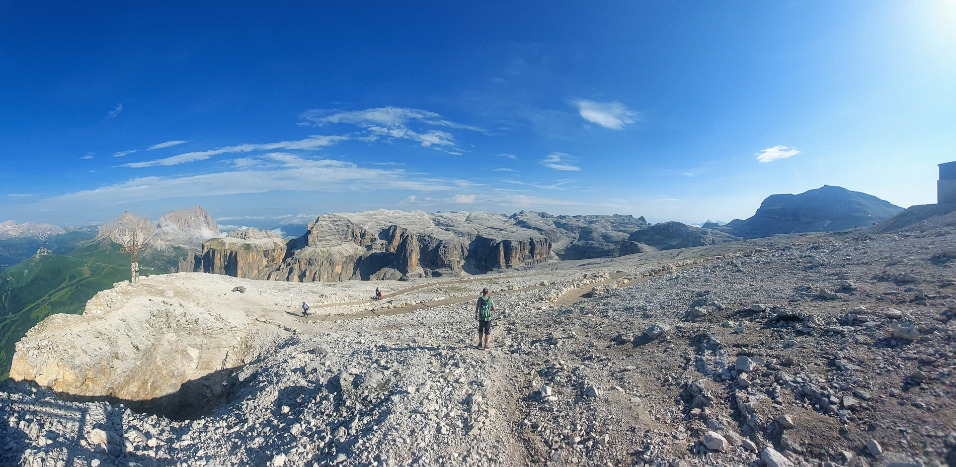 We starten relatief rustig in het Rosengartenmassief en volgen het pad boven het Val di Fassa richting de Sella. Onderweg passeren we de Seiser Alm, de grootste bergweide van Europa. De technische uitdaging neemt gaandeweg toe: luchtige passages, stukken waar je handen nodig hebt en enkele kettingzekeringen.