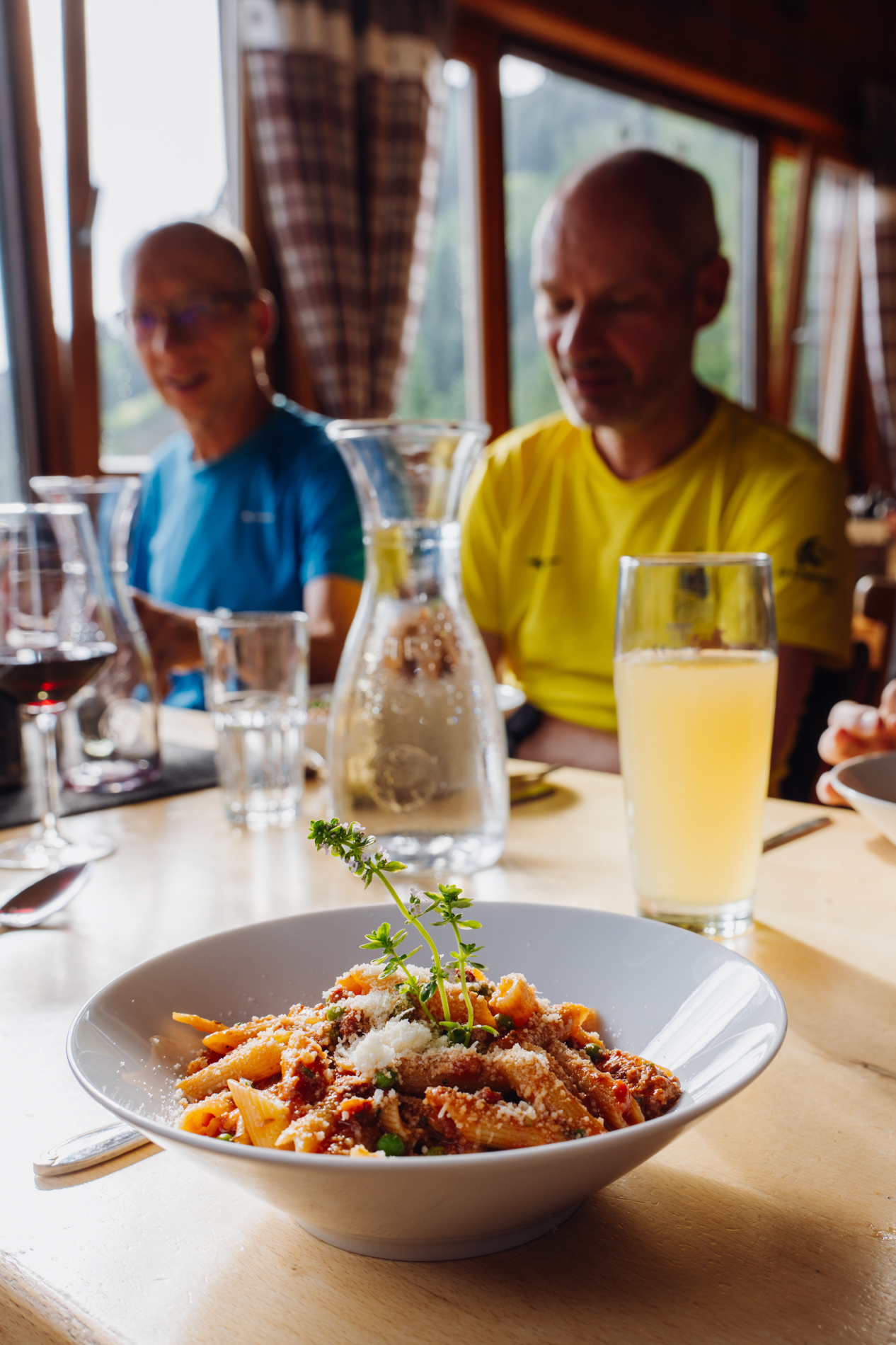 Hoewel je in de meeste berghutten geen culinaire hoogstandjes moet verwachten, wordt het eten in de hut steeds beter. Met dieetwensen als vegetarische maaltijden wordt doorgaans rekening gehouden als je deze bijtijds doorgeeft. Houd er wel rekening mee dat je in hooggelegen hutten die lastig bereikbaar zijn, minder tot geen keuze hebt in wat je eet. Wassen kan met een beetje geluk aan een kraan met warm water, maar steeds vaker kun je tegen betaling douchen. Na het avondeten plan je de tocht voor de volgende dag en pak je alvast je rugzak in. Om tien uur gaat het licht uit en geldt Hüttenruhe. Handig dus om een hoofdlamp bij je te hebben voor als je 's nachts naar de wc moet of 's ochtends vroeg opstaat.