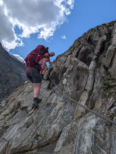 rotsplaten of gruishelling. Ook het oversteken van een sneeuwveld kan voorkomen tijdens de tocht. Soms loop je langs steile hellingen. Lastige stukken zijn meestal goed beveiligd, bijvoorbeeld met staalkabels of trap.