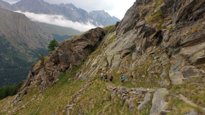 De route loopt dwars door het park, van west naar oost. Onderweg steken we twee bergruggen over: het Valgrisenche- en het Gran Paradiso-massief. We kruisen de dalen Val di Rhêmes en Val Savarenche en maken daarbij flink wat hoogtemeters.In de vroege zomer staan de dalen vol bloemen. Over het algemeen is de tocht technisch niet moeilijk, met goed begaanbare paden. Vanaf de derde dag komen we in hoogalpien terrein. Hier komen we blokkenterrein, losliggend puin en grijs,en soms enkele kabels tegen. Vroeg in het seizoen kunnen er nog sneeuwvelden zijn.