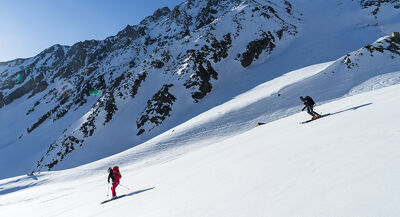 De Winnebachseehütte in de Stubaier Alpen is een perfecte standplaats voor toerskiërs. De hut ligt aan de Winnebachsee en is omgeven door 3000’ers, zoals de Breiten Grieskogl (3287 m) en de Winnebacher Weisskogel (3185 m), ideaal voor mooie toerskitochten. Om de 3054 meter hoge Hohen Winnebachspitze te kunnen bereiken, moeten we eerst vanaf de Putzenscharte een stukje abseilen. We sluiten de week af met een beklimming van de Larstigsscharte (3013 m), waarna je een prachtige afdaling maakt door het eenzame Larstigtal naar Niederthai. De berghut waar we overnachten, heeft een heerlijk zonneterras met uitzicht op een bevroren waterval.