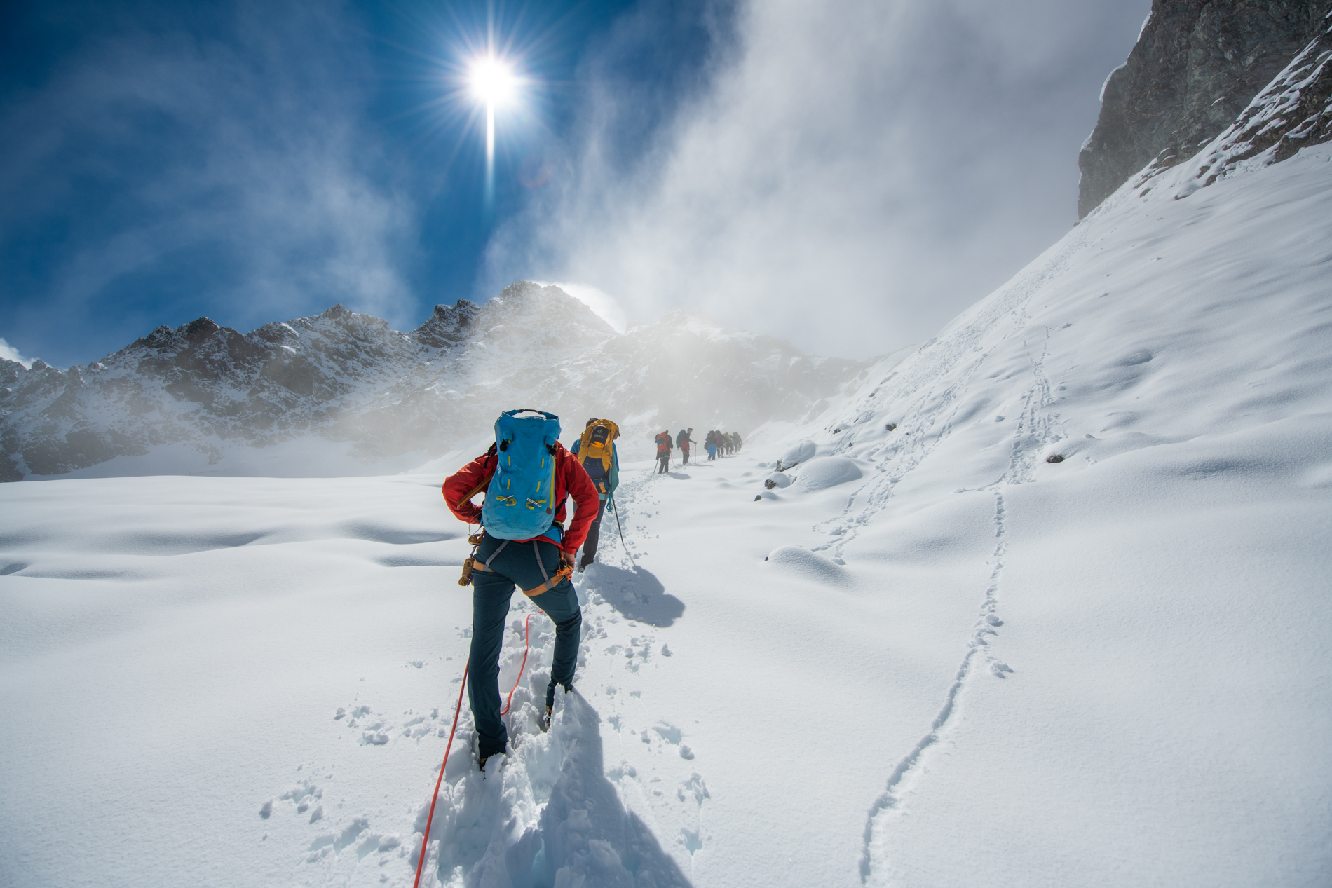 Bergsportreizen zorgt voor de klimtechnische uitrustingsstukken zoals pickel, stijgijzers, bergsporthelm, sportklimgordel en klimtouw.