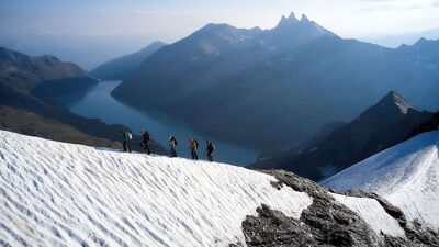 Met een volle rugzak gaan we halverwege de week naar de hoog gelegen Cabane de Dix (2929 m). Pickel en stijgijzers inpakken dus en op naar het ijs!. We starten met het oefenen van de benodigde technieken op de gletsjer. De wekker gaat vroeg, want de beklimming van de La Luette (3369 m) staat op het programma. Aan touw en sporen in de sneeuw. Ook brengen we de geleerde theorie van tochtplanning in de praktijk en herhalen we de nodige knopen. Belangrijk, want op de een na laatste dag staat de zware maar zeer uitdagende en mooie beklimming van de Pigne d’Arolla (3796 m) op het programma. Echt een Hoogtepunt met de hoofdletter H, waarop alles wat je afgelopen week geleerd hebt, bij elkaar komt. Het je je topvlag en camera mee? Deze tocht wil je met iedereen delen!