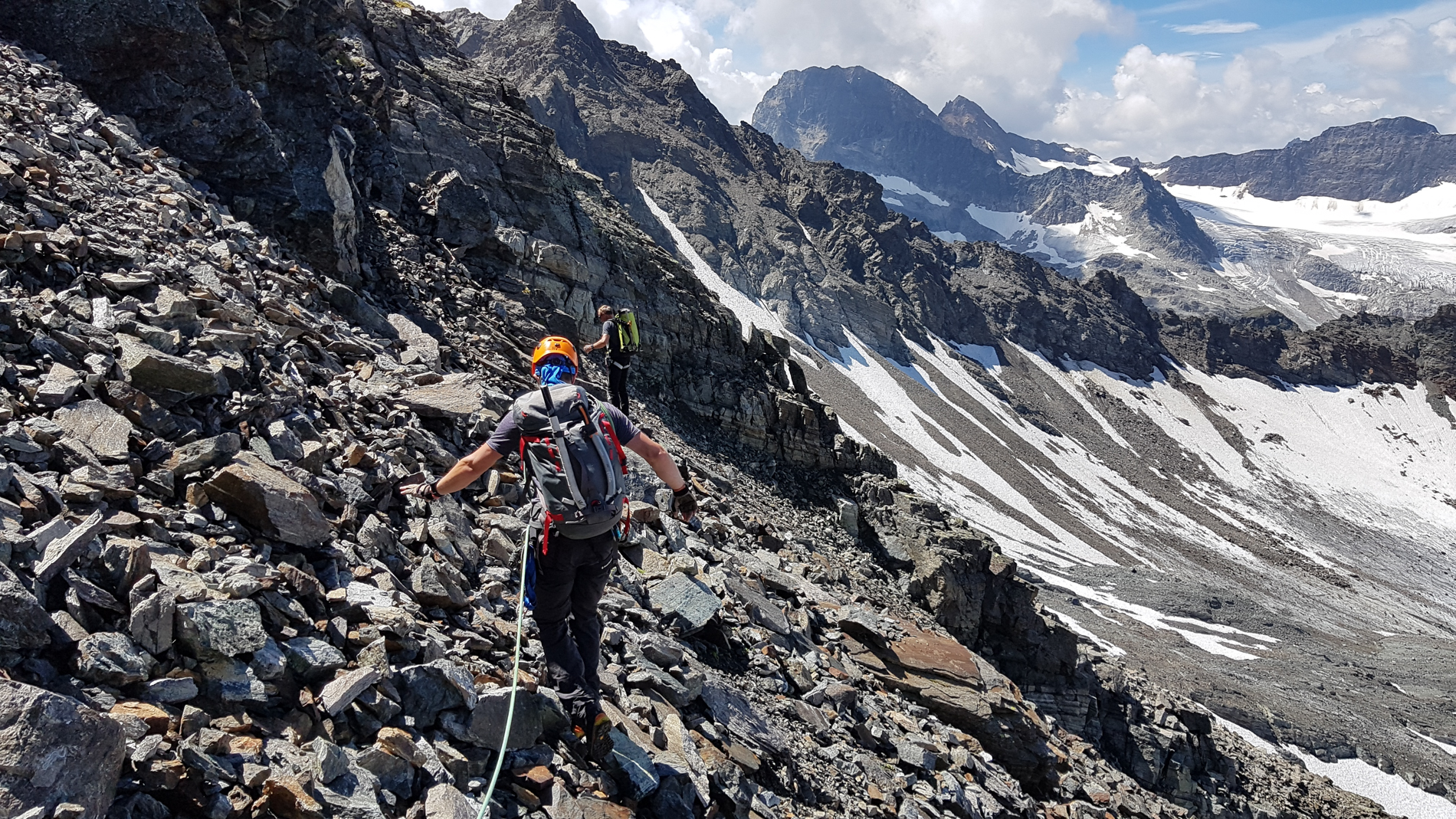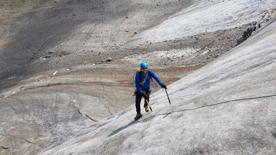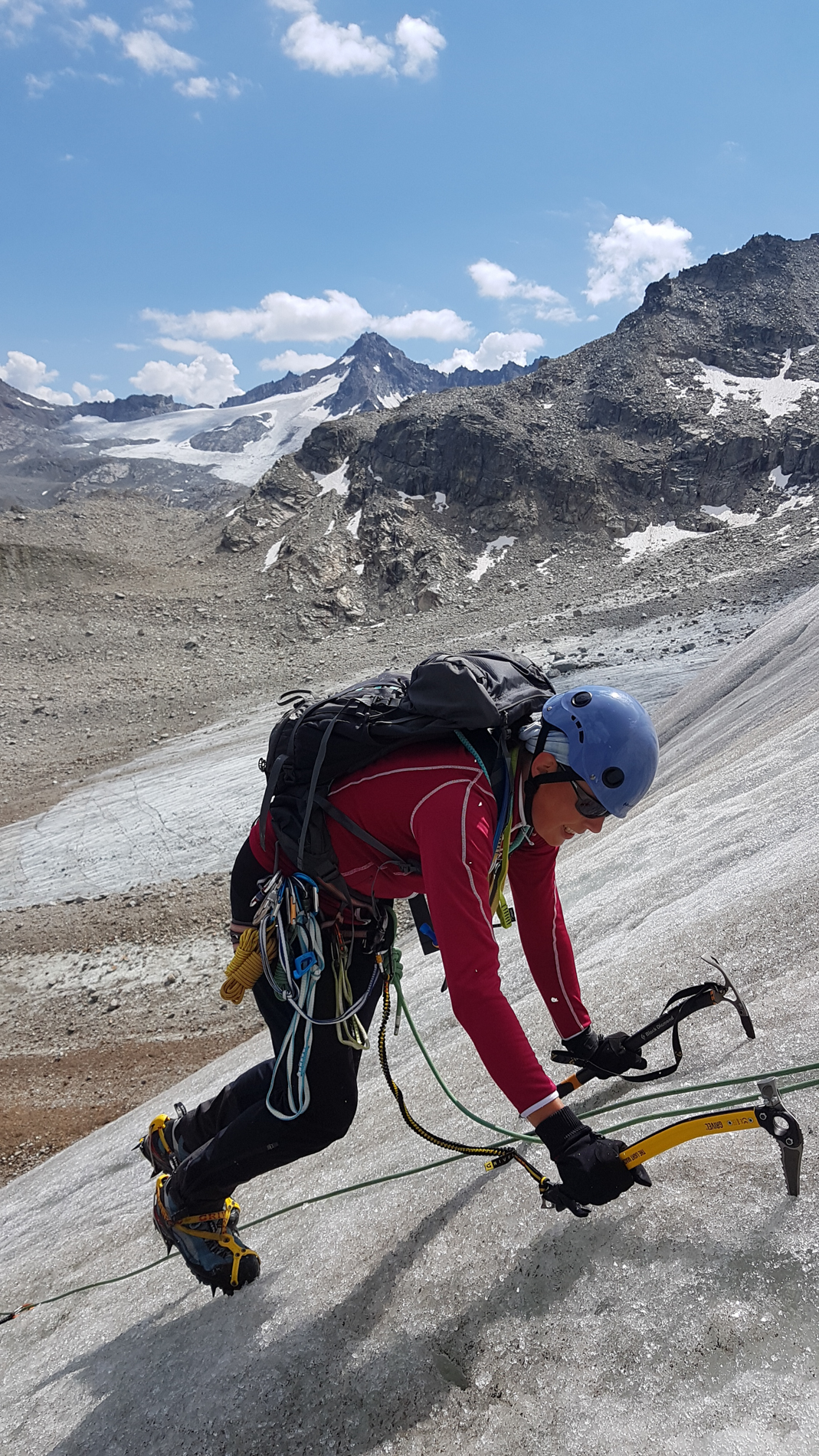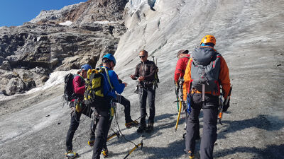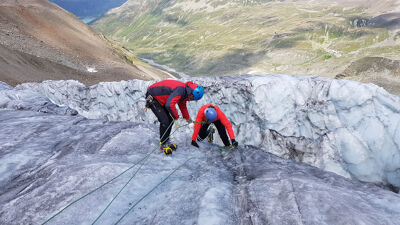 Op de Ochsentaler gletsjer oefen je stijgtechniek in stijl ijs en perfectioneer je reddingstechnieken in het spletenlabyrint op weg naar het gletsjerplateau. Daarna beklim je via twee steile ijswanden de Signalhorn (3210 m) en steek je over naar de Tuoi Hütte via een imposante rotsgraat.