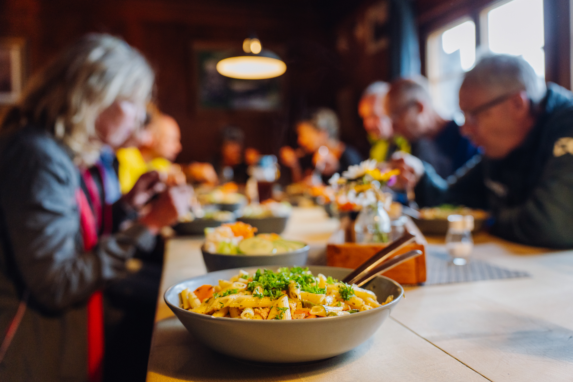 Hoewel je in de meeste berghutten geen culinaire hoogstandjes moet verwachten, wordt het eten in de hut steeds beter. Met dieetwensen als vegetarische maaltijden wordt doorgaans rekening gehouden als je deze bijtijds doorgeeft. Houd er wel rekening mee dat je in hooggelegen hutten die lastig bereikbaar zijn, minder tot geen keuze hebt in wat je eet. Wassen kan met een beetje geluk aan een kraan met warm water, maar steeds vaker kun je tegen betaling douchen. Na het avondeten plan je de tocht voor de volgende dag en pak je alvast je rugzak in. Om tien uur gaat het licht uit en geldt Hüttenruhe. Handig dus om een hoofdlamp bij je te hebben voor als je 's nachts naar de wc moet of 's ochtends vroeg opstaat.