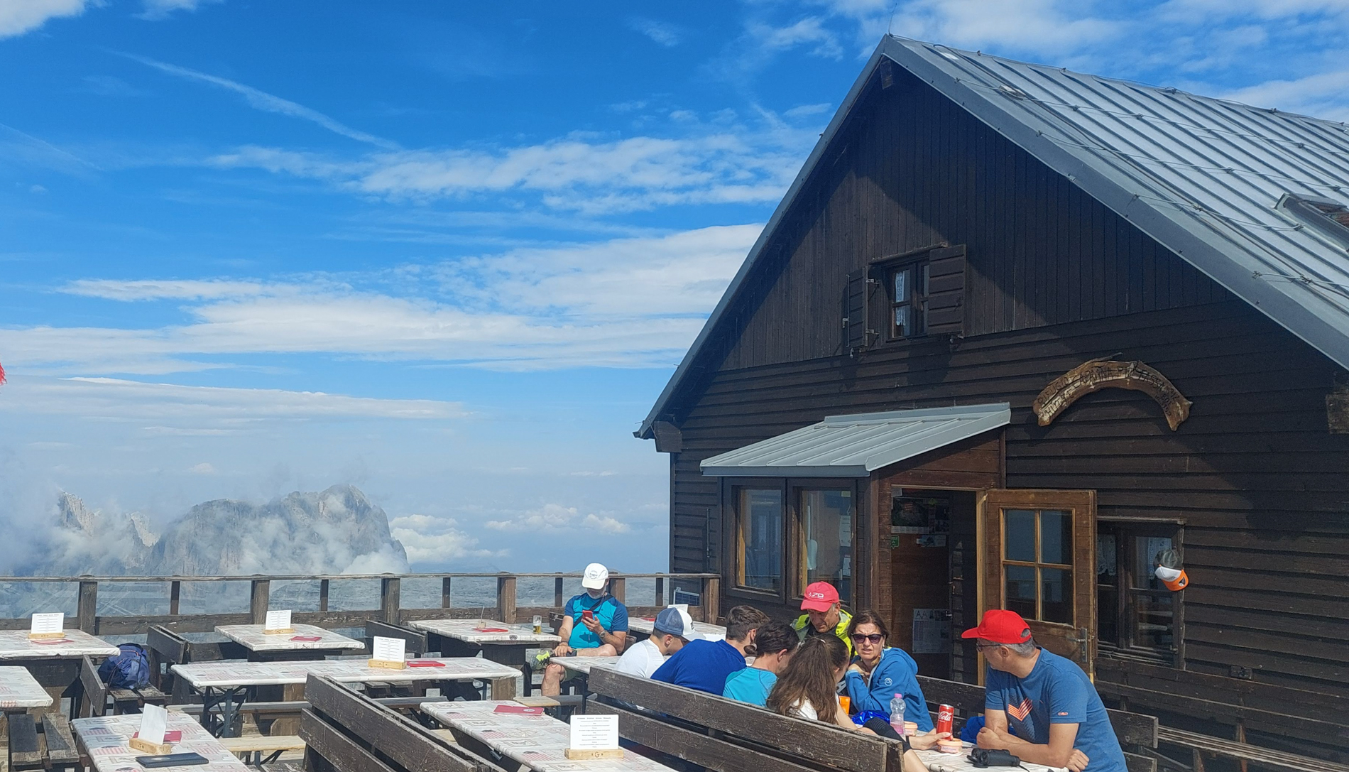 We starten relatief rustig in het Rosengartenmassief en volgen het pad boven het Val di Fassa richting de Sella. Onderweg passeren we de Seiser Alm, de grootste bergweide van Europa. De technische uitdaging neemt gaandeweg toe: luchtige passages, stukken waar je handen nodig hebt en enkele kettingzekeringen.