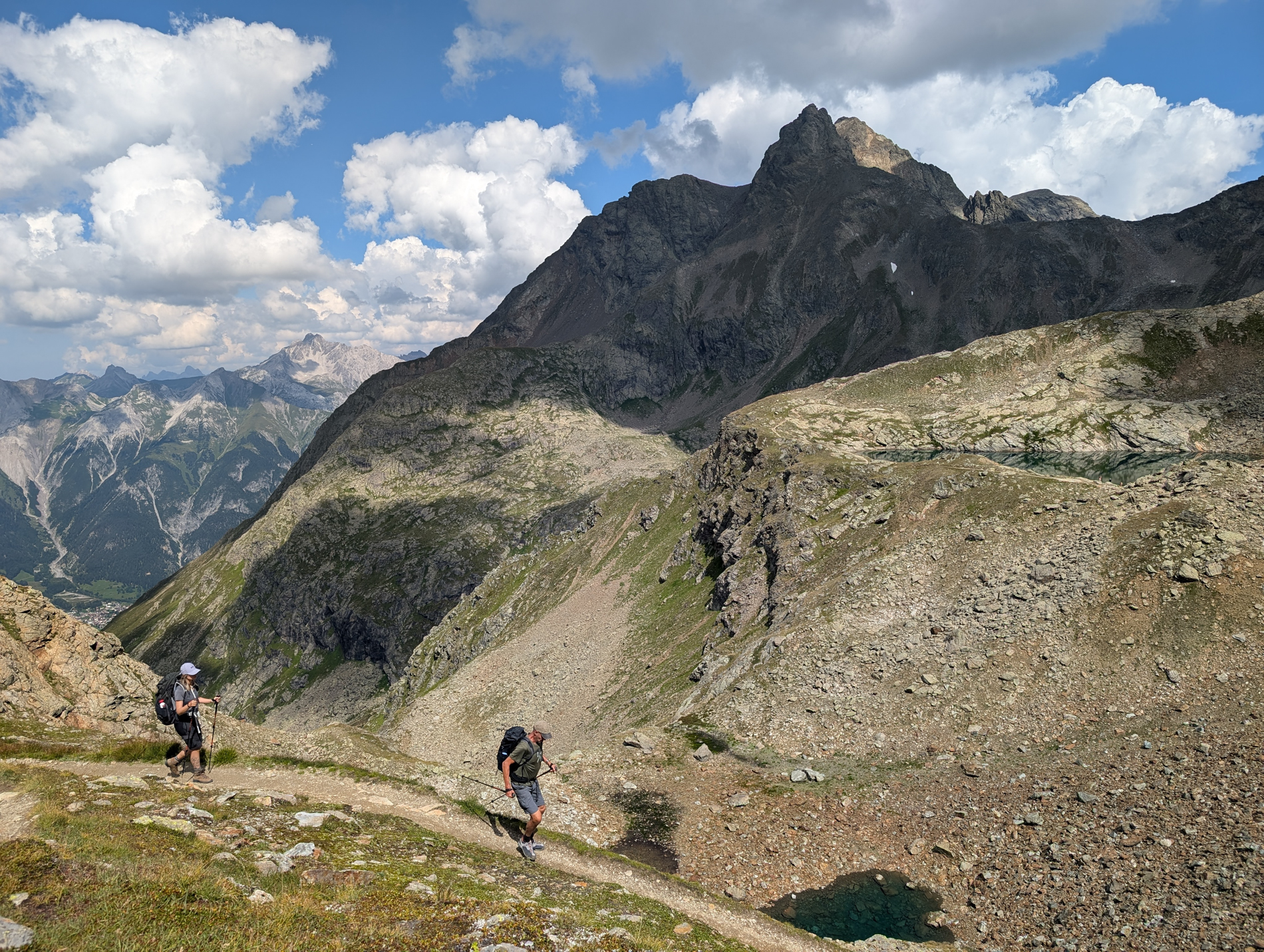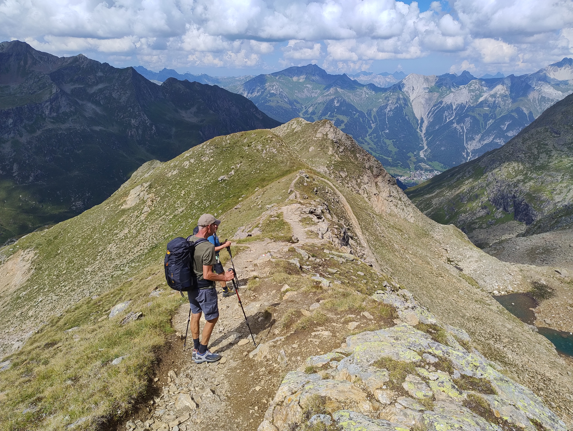Wanneer de omstandigheden het toelaten, klimmen we naar verschillende toppen. De Vertinesbleiskopf (2706 m) en de Scheibler (2978 m) liggen op onze route, en we maken een dagtocht naar de Hohe Riffler (3168 m). Vanaf de bergkammen hebben we uitzicht op de toppen van de hogere Silvrettagroep en de Patteriol, de toonaangevende berg in de Verwall.