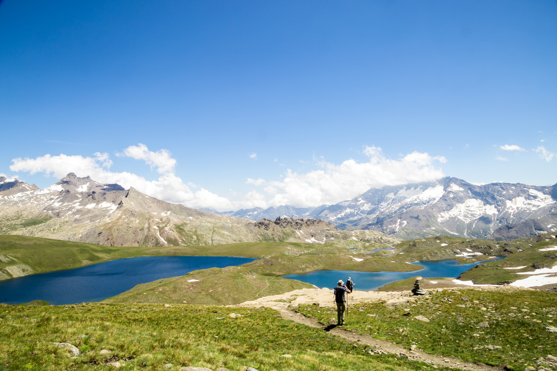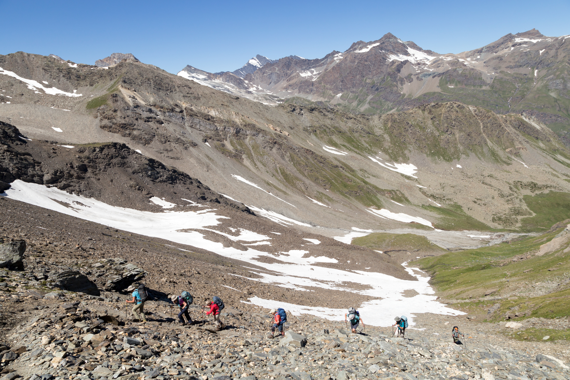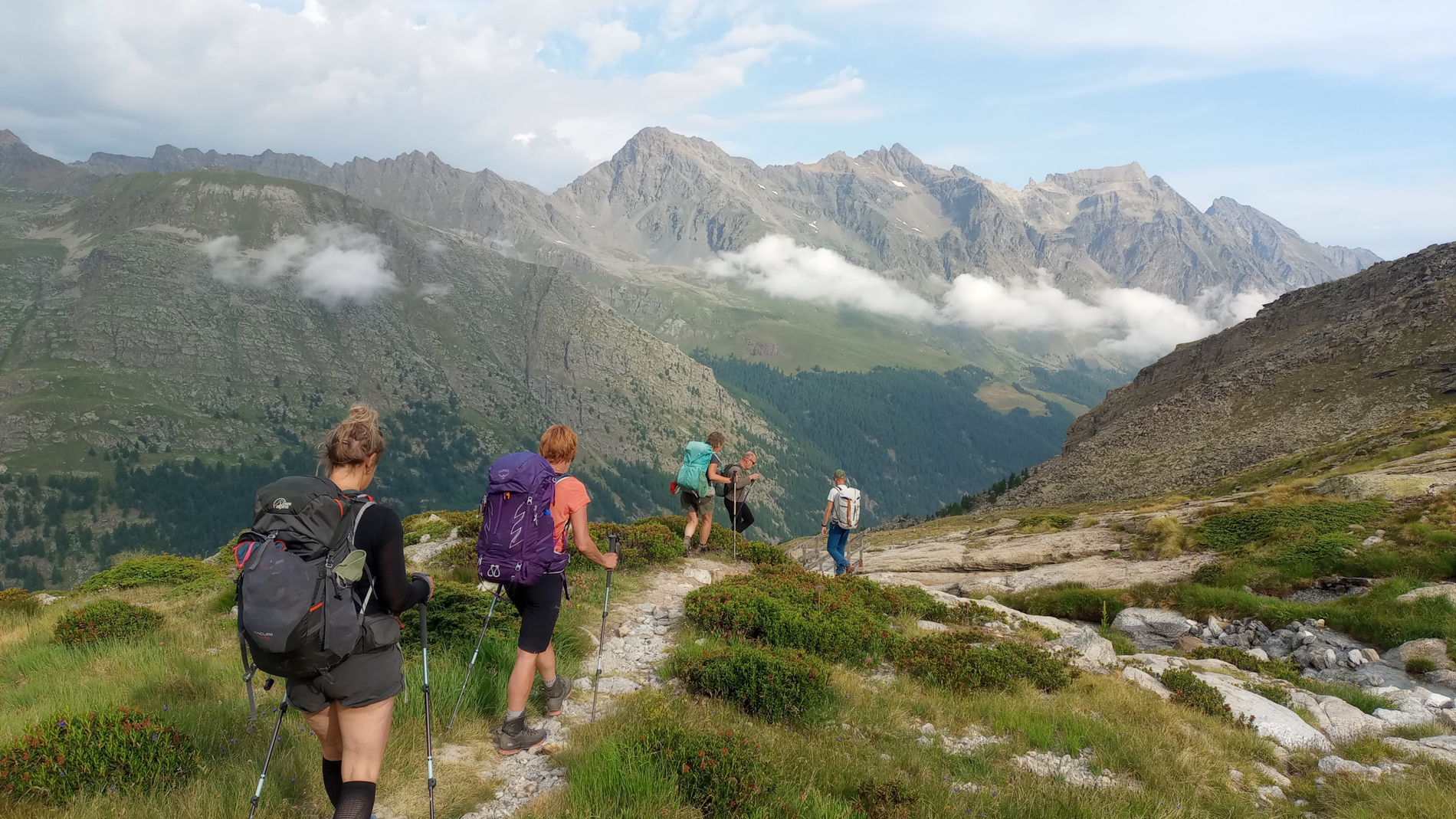 De route loopt dwars door het park, van west naar oost. Onderweg steken we twee bergruggen over: het Valgrisenche- en het Gran Paradiso-massief. We kruisen de dalen Val di Rhêmes en Val Savarenche en maken daarbij flink wat hoogtemeters.In de vroege zomer staan de dalen vol bloemen. Over het algemeen is de tocht technisch niet moeilijk, met goed begaanbare paden. Vanaf de derde dag komen we in hoogalpien terrein. Hier komen we blokkenterrein, losliggend puin en grijs,en soms enkele kabels tegen. Vroeg in het seizoen kunnen er nog sneeuwvelden zijn.