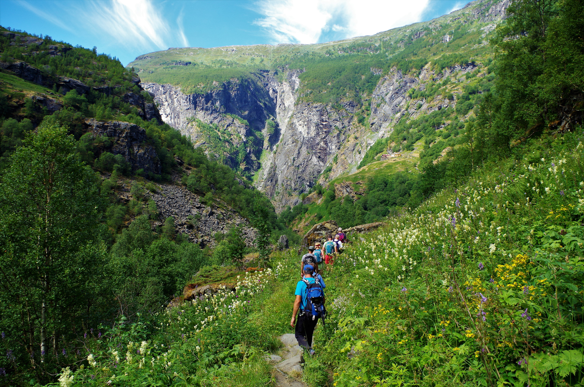 Het Aurlandsdal in Skarvheimen is een indrukwekkend bergdal dat de Noren niet voor niets ‘het dal der dalen’ noemen. Ooit was dit de belangrijkste handelsroute tussen Oost- en West-Noorwegen, nu is het een van de historische wandelroutes van het land. Wie lopen langs een wilde rivier die zich een weg snijd door een smalle kloof, terwijl je onderweg steeds uitzicht hebt op het fjord ver beneden.