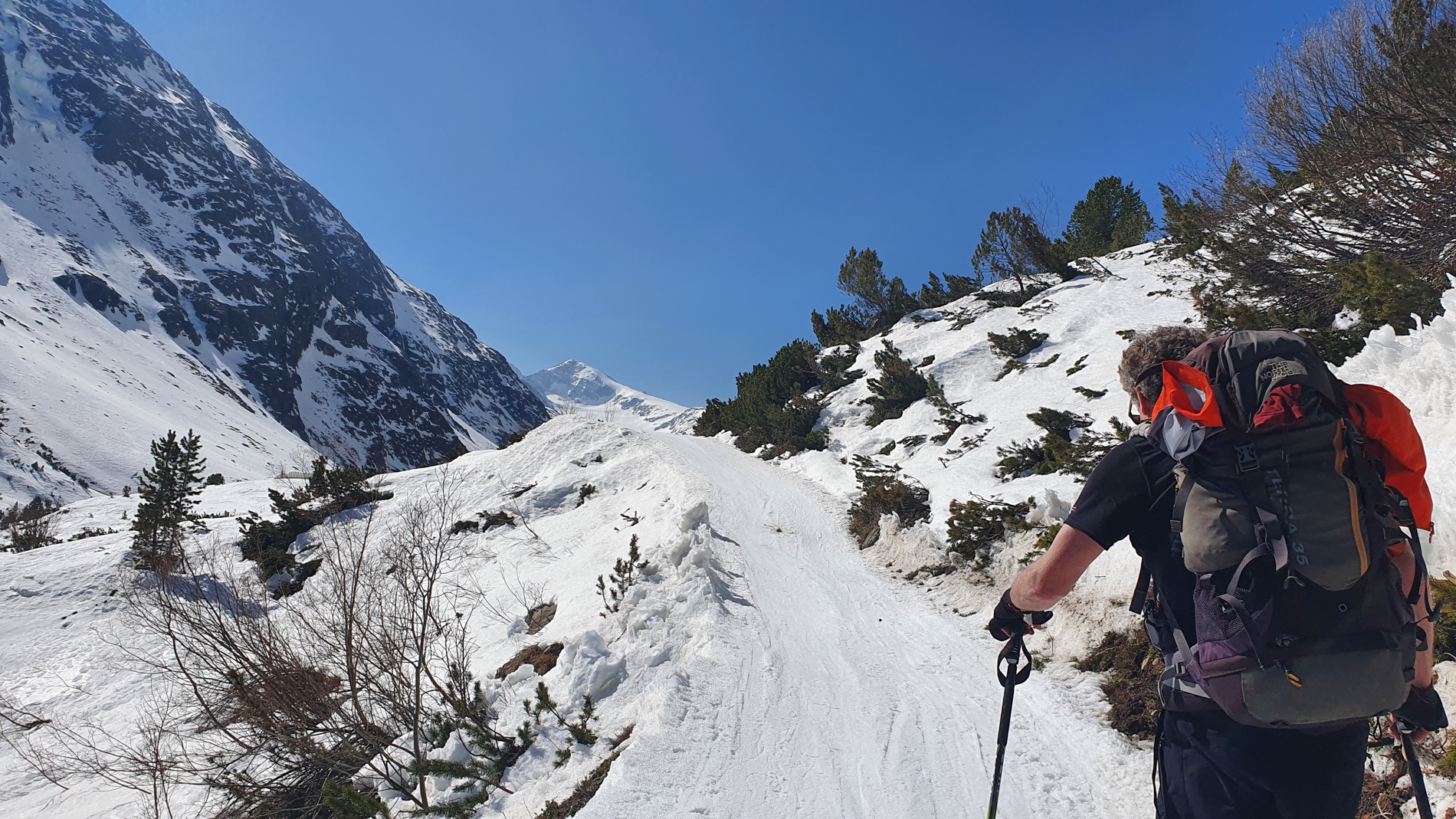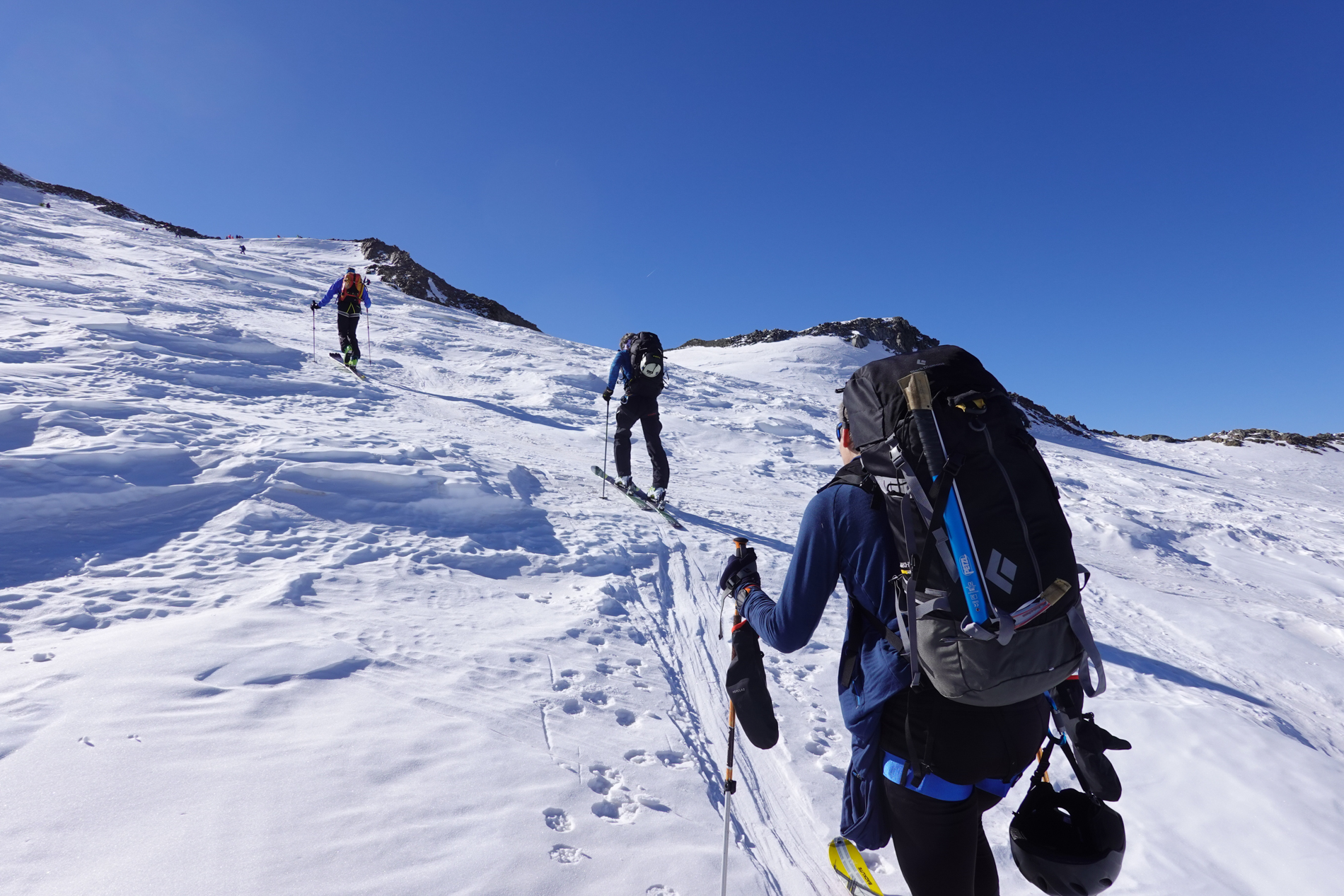 Moderne toerski’s, toerenbinding met skistoppers, met skistoppers, stijgvellen, harschijzers en skistokken. Materialen moeten goed afgesteld en passend zijn. Advies breedte toerksi’s 90-100 mm onder de binding.